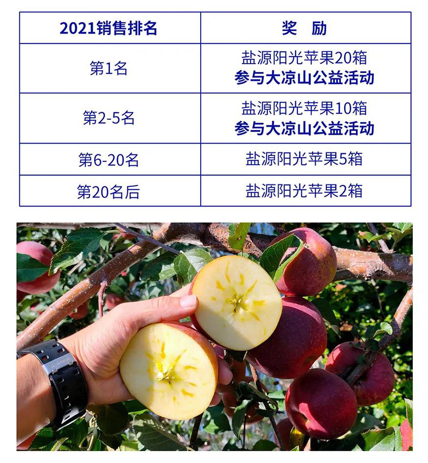 凡在2021年1月1日至2021年9月30日期間,有交易記錄的普愛會員,按照銷售排名可領取不同數量的鹽源陽光蘋果。(以全款到賬時間結算)