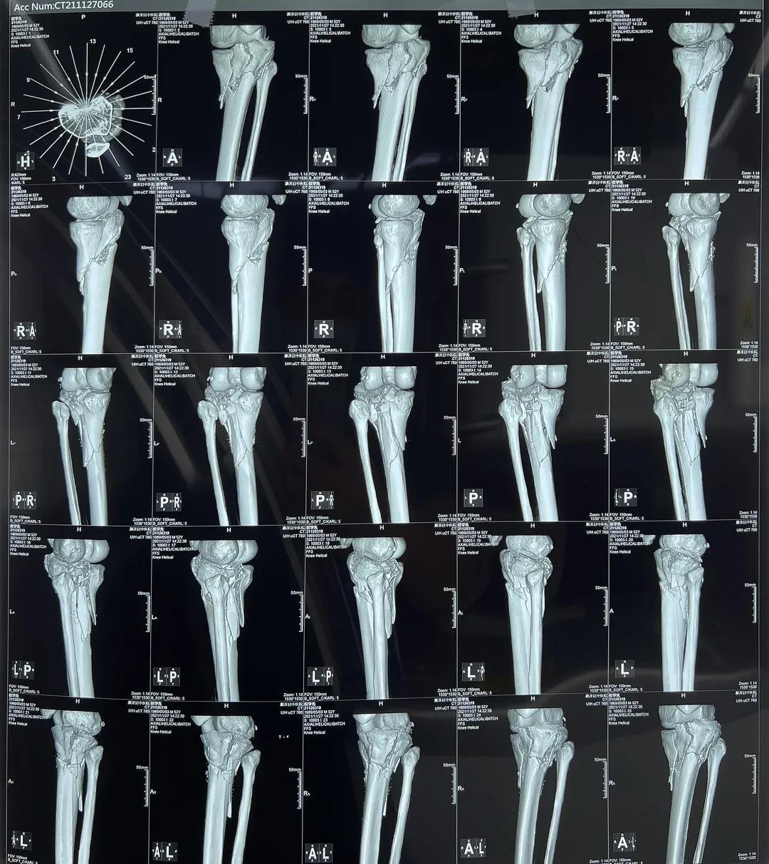 術前CT三維重建影像可見脛骨平臺處粉碎性骨折